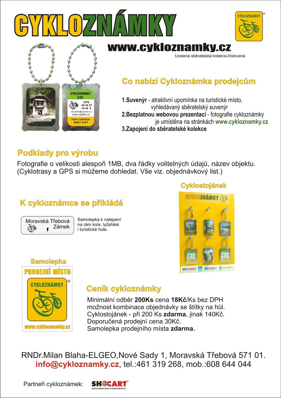 nemáte již cyklokarty, ztratili jste kontrolní kupony, nemáte nálepku prodeního místa, nebo jich potřebujete více, nemáte cyklostojánek, nebo je vám nejasné cokoli z projektu Cykloznámky, neváhejte nás kontaktovat, vše vám rádi vysvětlíme, připravíme, zašleme...